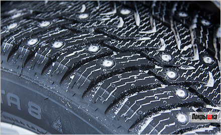 Разработчики так же отметили, что рисунок восьмерки, имеющий более мелкие шашки, лучше приспособлен для продуманной посадки шипов. (Помимо этого шипованные шины лучше охлаждаются и как следствие меньше подвержены износу).