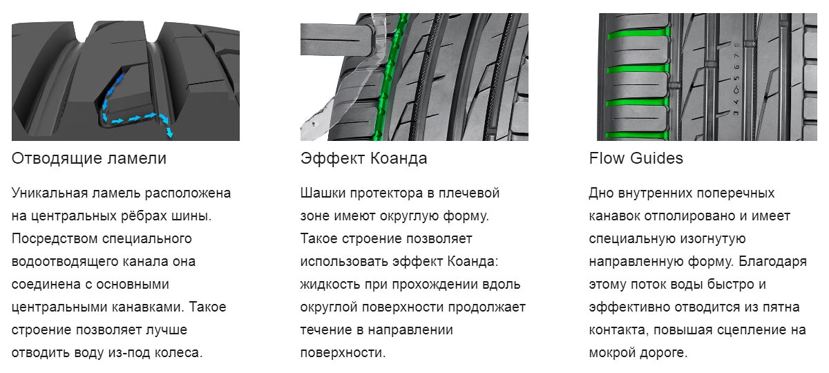 - Технология Dry Touch. Она предусматривает нарезку ламелей для повышения сцепного эффекта и увеличения пропускной способности дренажной системы. Ламели являются расширяющимися к основанию, поэтому по мере износа протектора их внутреннее пространство увеличивается.